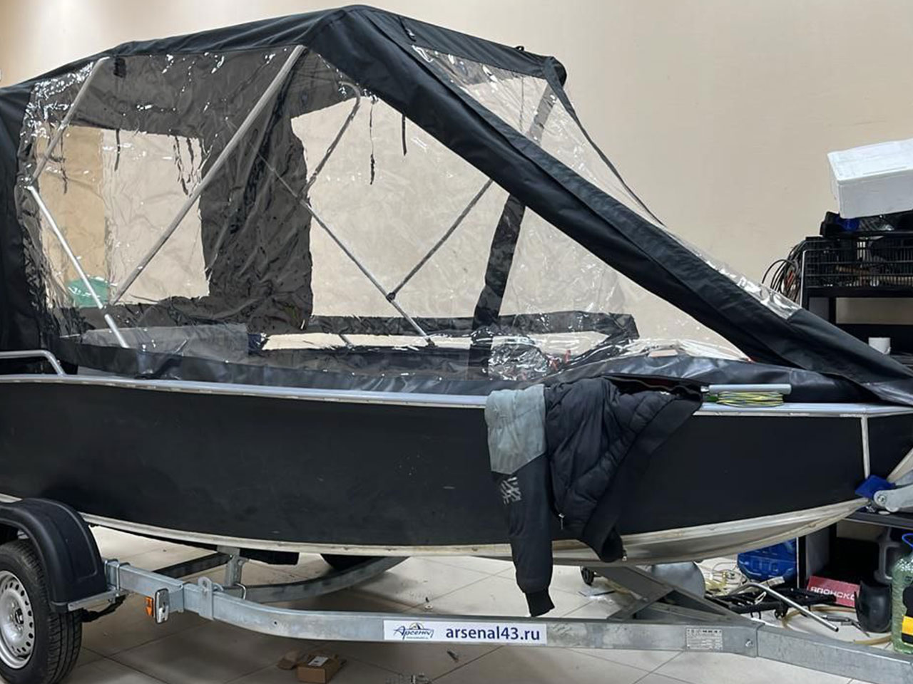 Ходовой тент Оптима для лодки Волжанка 42 Scout с прозрачными боковинами